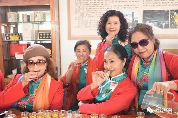 云臺冰菊,花型完整,色澤金黃。開水沖泡后如鮮花盛開,呈繡球般飽滿,燦爛如花,沸騰如霞,入口清香微甘,回味無窮,具有清肝明目之功效。